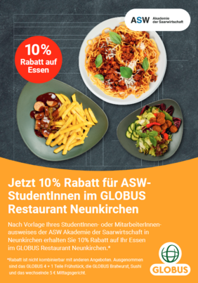 Nach Vorlage Ihres StudentInnen- oder MitarbeiterInnen-ausweises der ASW Akademie der Saarwirtschaft in Neunkirchen erhalten Sie 10% Rabatt auf Ihr Essen